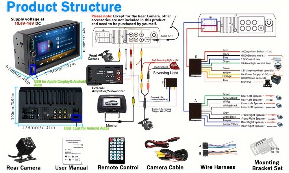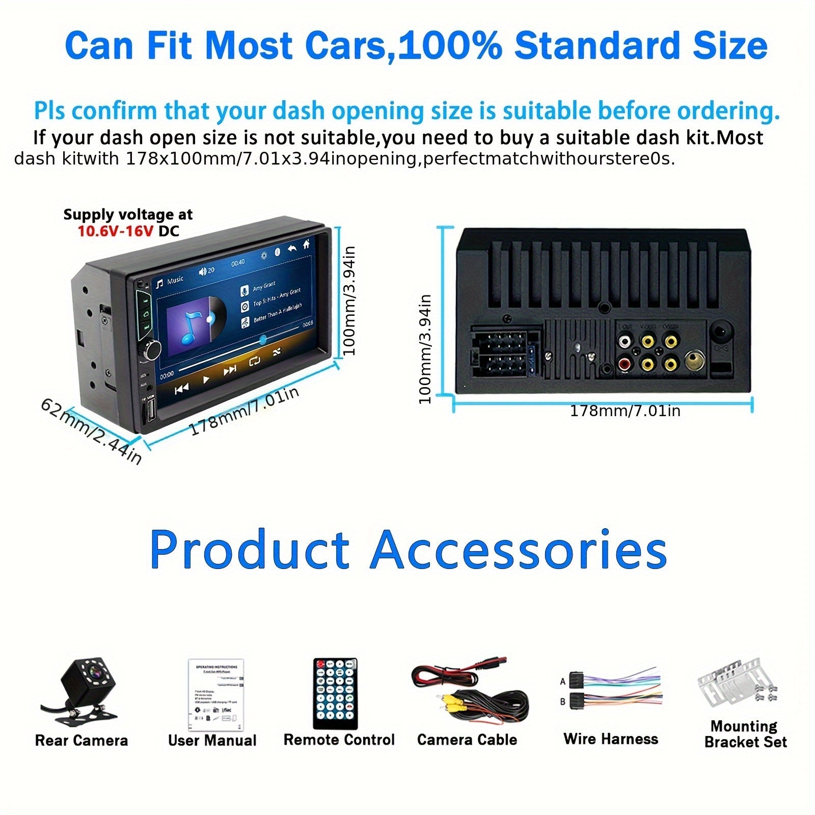【What You Will Get】- Come With 1* 2 Din Car Stereo+1* Rear View Camera+1* Backup Camera Cable+1* Remote+1* Harness+2* Brackets+4* Screws+1* English Maual. Welcome To Contact Our 24-hour Online Customer Service If You Have Any Questions About Installation And Wiring.