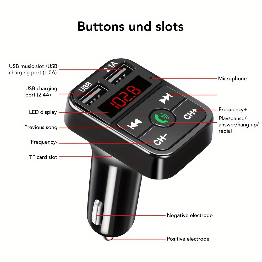 Wireless Car FM Transmitter Kit - 5.0 Bluetooth MP3 Player, Handsfree Audio Receiver, 2.1A Dual USB Phone Charger, and Car Accessories for Universal Vehicles - Easy to Use, Compact Design